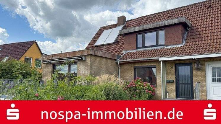 Doppelhaushälfte mit überdachter Terrasse und Solarthermie für die Warmwasseraufbereitung.